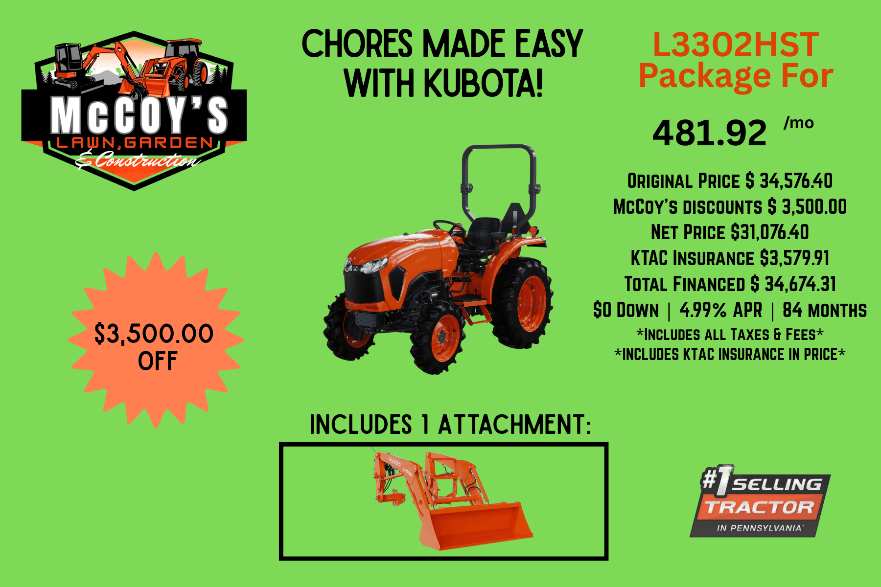 Make your chores easy and ditch the wheelbarrow with the Kubota L3302HST equipped with a front end loader! This tractor puts time back in your hands! With an outstanding $3,500 in discounts, you don’t want to miss this! With all discounts, taxes, fees, and insurance your total amount financed $34,674.31, with a monthly payment for 84 months @ 4.99% APR is $481.92. Call our sales department today for more information!