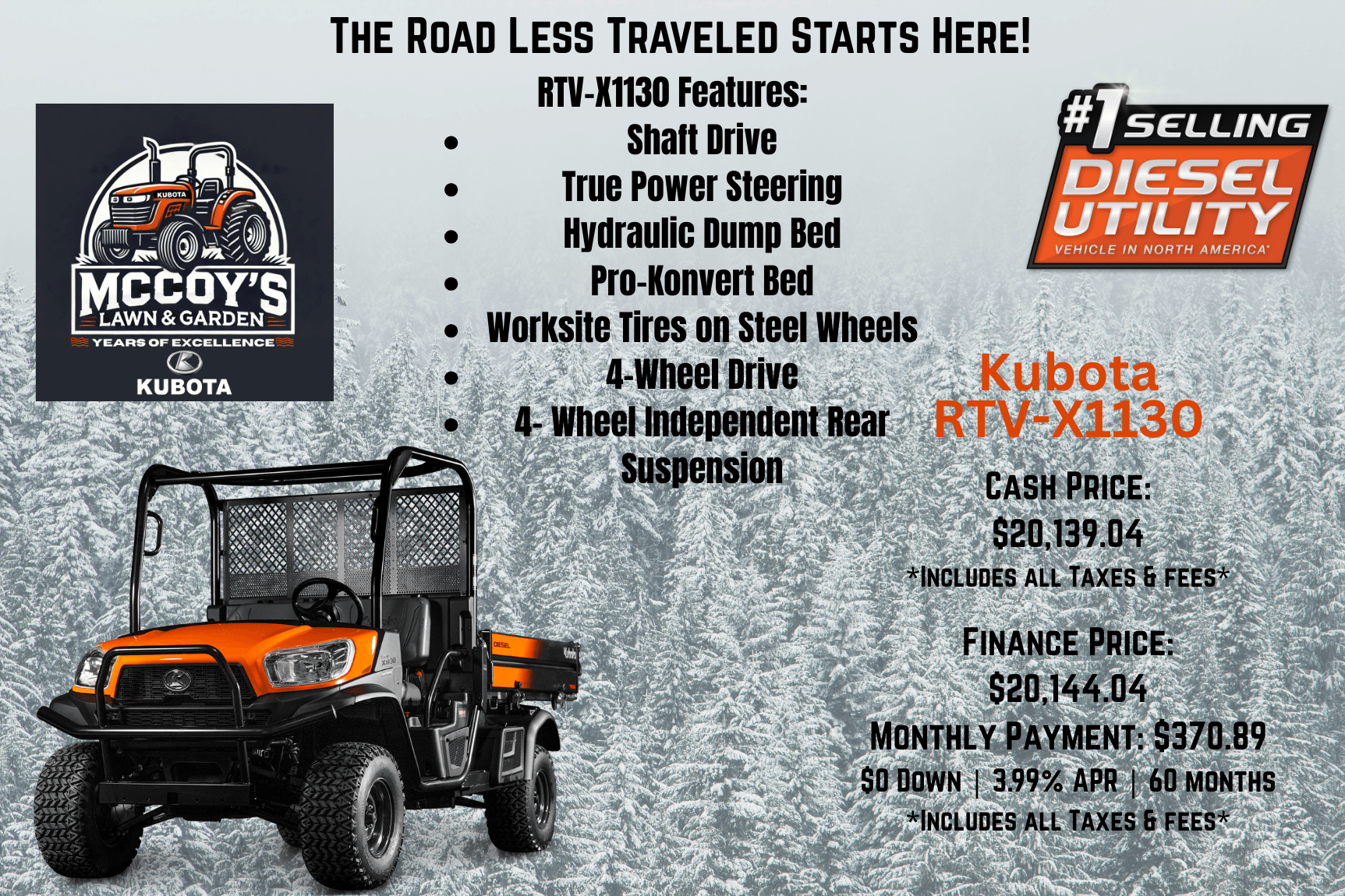 Take over the roads less traveled on with the Kubota RTV-X1130 Pure Utility Vehicle, the #1 selling Utility Vehicle in North America. Cash and Financing Options Available. Cash Price $ 20,139.04. Finance Price $20,144.04, 60 months @ 3.99% APR, monthly payment $370.89.