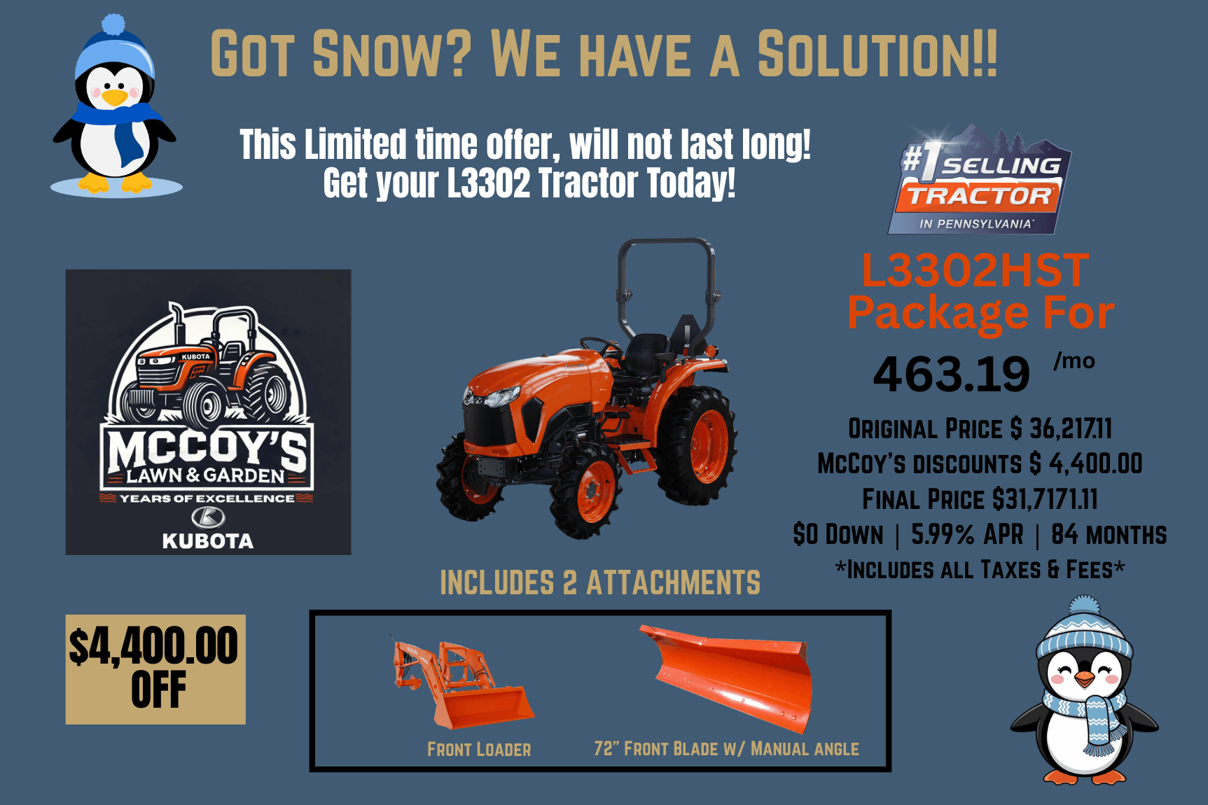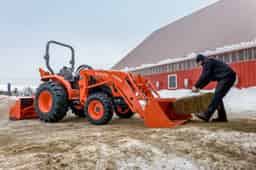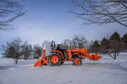 The Kubota L3302HST is perfect for snow, this tractor comes equipped with R4 Tires, a front loader with quick attach bucket.