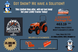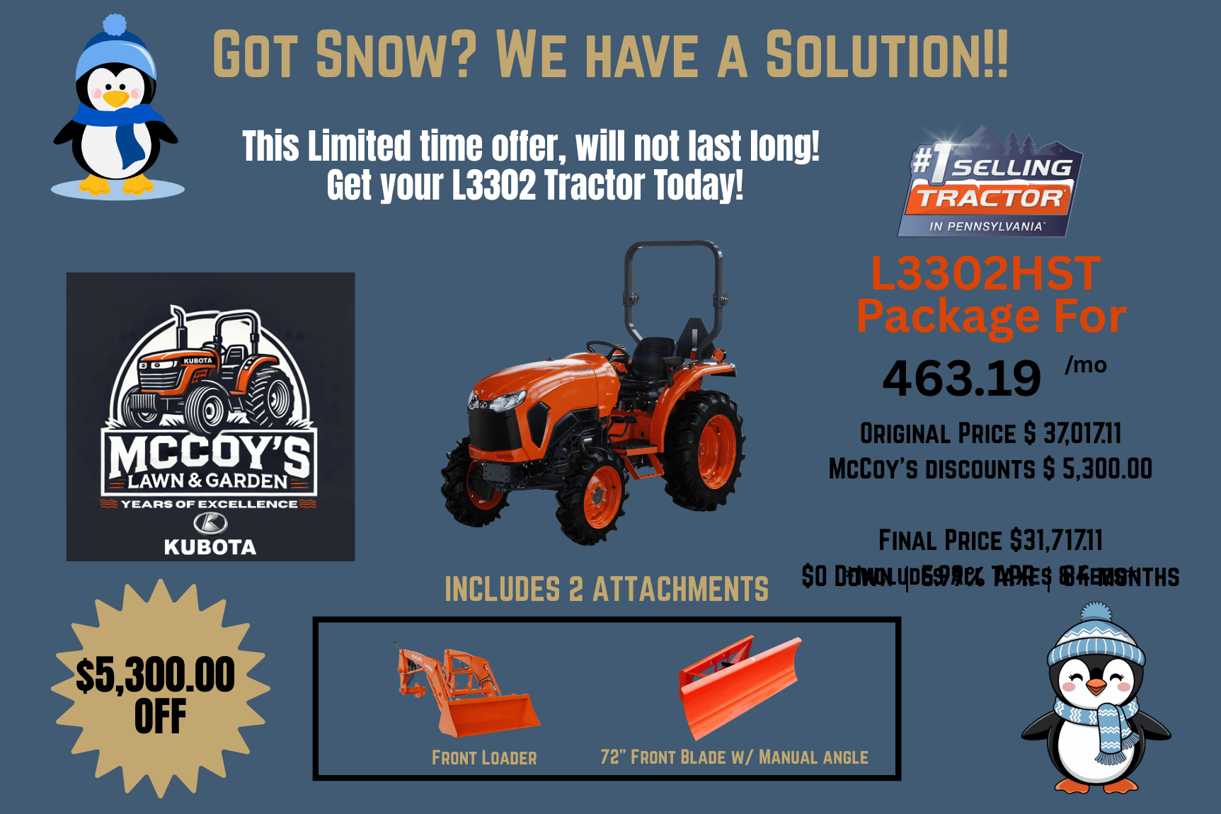 The Kubota L3302HST is perfect for snow, this tractor comes equipped with R4 Tires, a front loader with quick attach bucket. and a 72″ Front Quick attach blade with manual angle. Perfect for the home or on the farm. Kubota has excellent low interest financing, 84 months at 5.99% APR. With a INCREDIBLE discount of $5,300!!