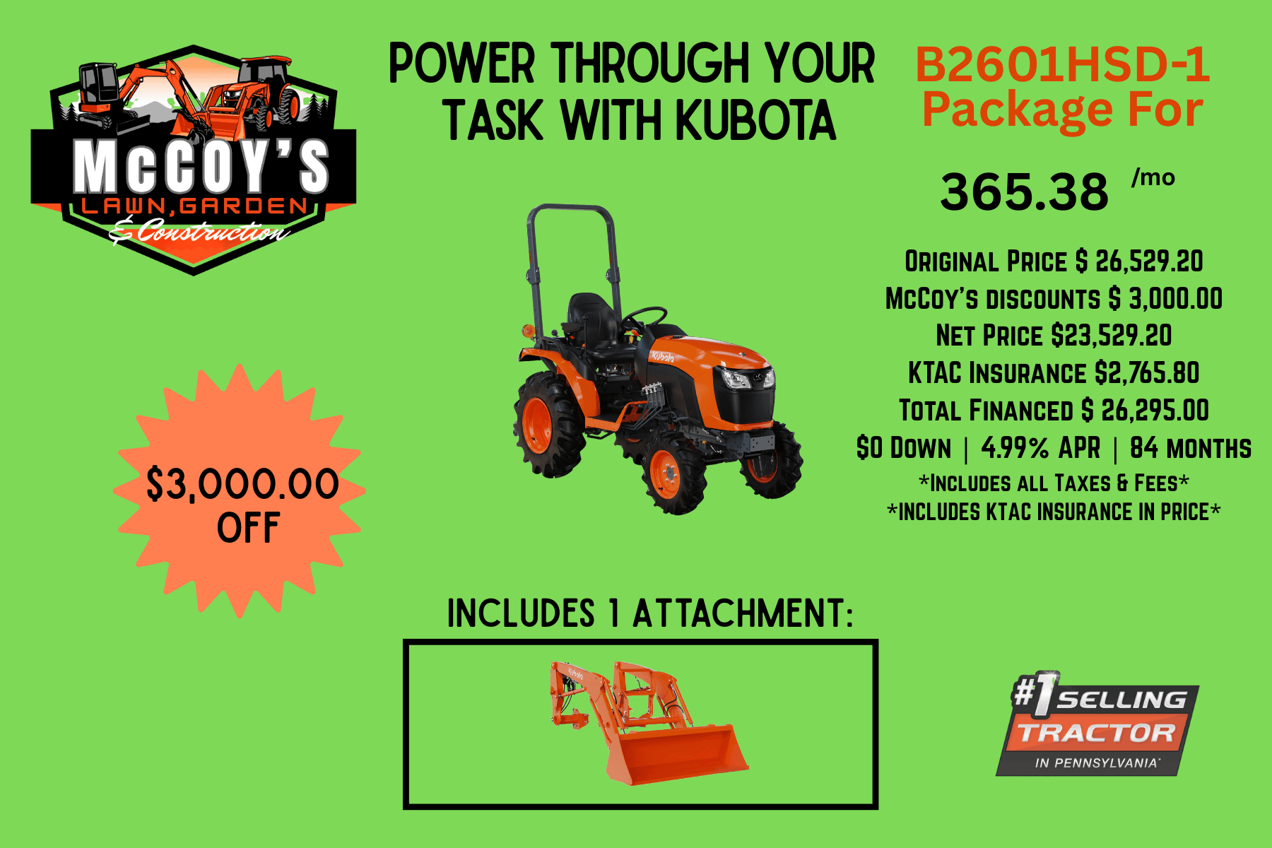 Power through your daily task with the Kubota B2601HSD-1 equipped with a front end loader! You don’t want to miss out on these excellent savings with discounts of $3,000.00. With all discounts applied, taxes, fees, and insurance your total amount financed is $26,295.00 with a monthly payment of $365.38 for 84 months @ 4.99% APR.